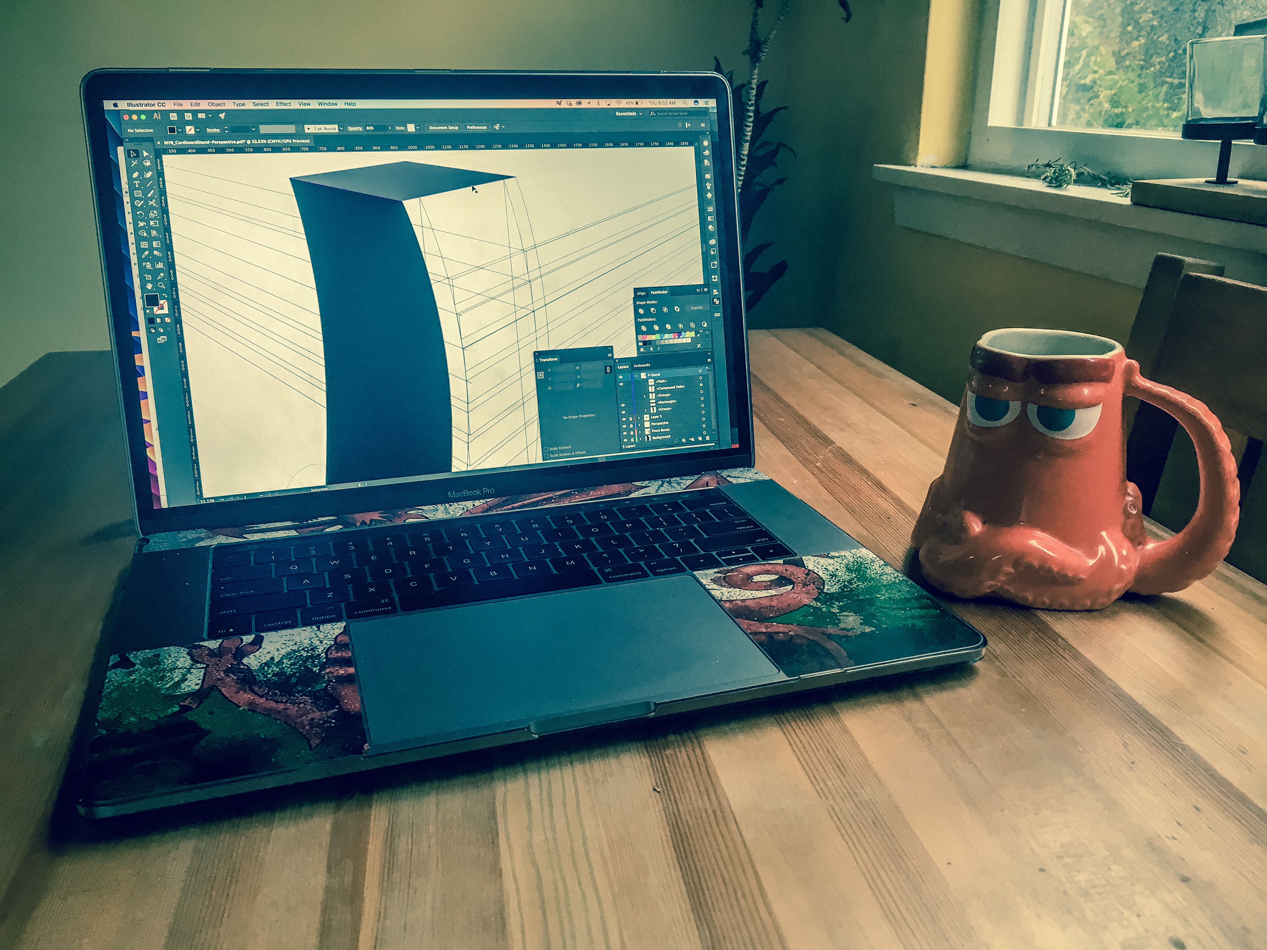 A perfect cup of coffee in the perfect mug with my perfect MacBook Pro. Let the 3D rendering of this new retail stand design commence.